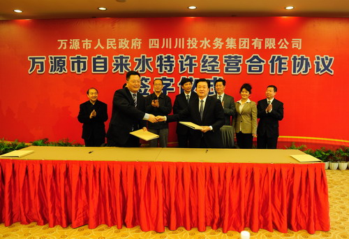 签字仪式上,集团公司副总经理、川投水务集团董事长李文志与中共万源市委副书记、市人民政府市长吴晓勇签订了《万源市城区自来水特许经营合作协议》;川投水务集团总经理梁有国与万源市国资办主任陈守英签订了《民生供排水公司国有产权和特许经营权转让协议》。根据两个协议,川投水务集团收购民生公司全部产权和万源市城区30年自来水特许经营权,并投资建成驮山水厂,有效解决万源市城区市民用水困难的问题。两个协议的签订,标志着川投水务集团在项目拓展、壮大规模方面取得新的进展。