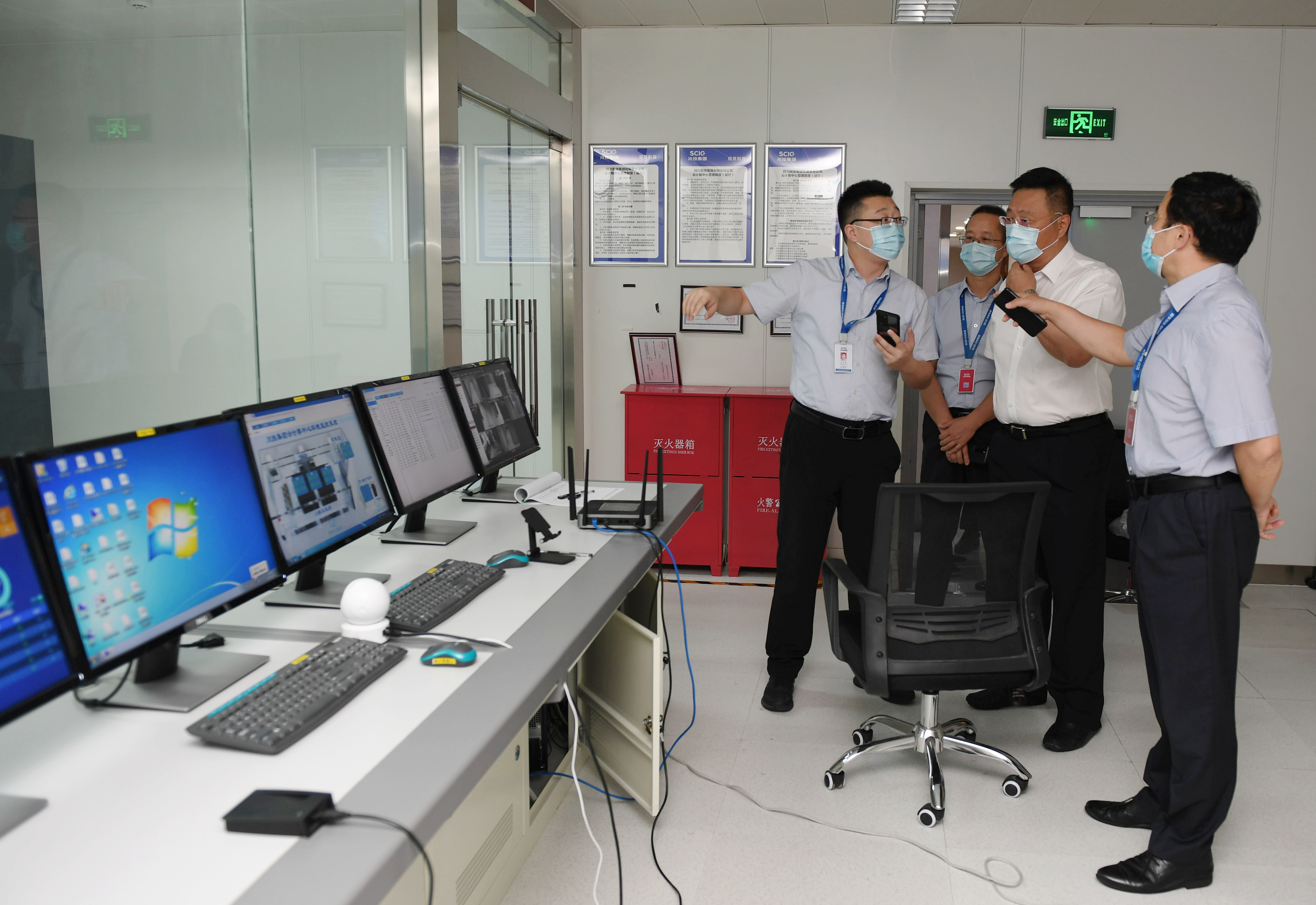 李文志、王怀林分别对川投大厦出入口、集中隔离点、职工食堂、监控室及云计算中心等重要点位进行了检查,详细查看了安全监控、环境消杀、消防物资储备等落实情况。