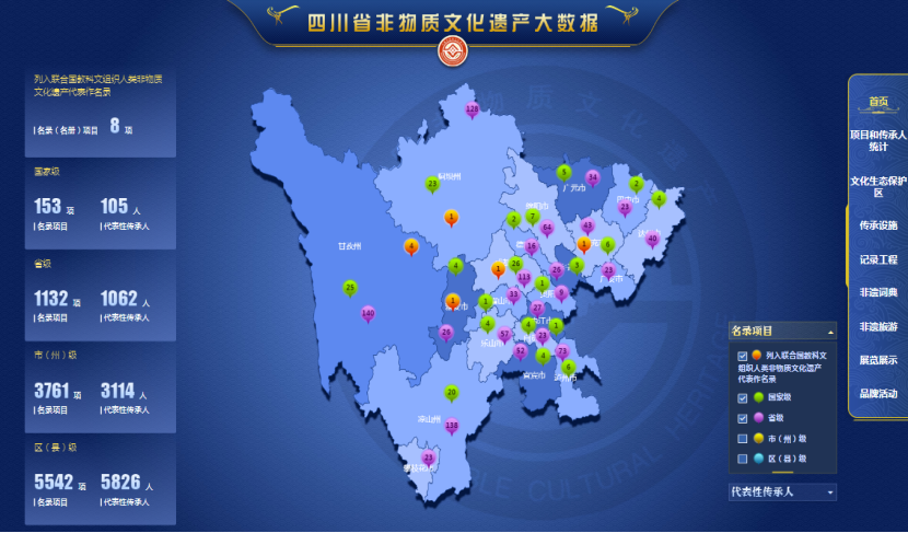 “四川省非物质文化遗产大数据”平台以数字化方式记录、保存和展示四川非遗资源,从前端界面、后端管理系统、数据库迁移上云等方面进行了全方位设计,以可视化方式集中展示了四川非遗的图文影音资源、地域分布、多维度统计数据。该平台涵盖代表性项目、代表性传承人、传承设施等基础数据,此外,还囊括了记录工程、文化生态保护区、非遗词典、非遗旅游、展览展示、舆情管理等重要非遗保护工作成果,为非遗保护工作者提供专业的信息和服务,为广大观众更好地了解非遗提供了窗口。