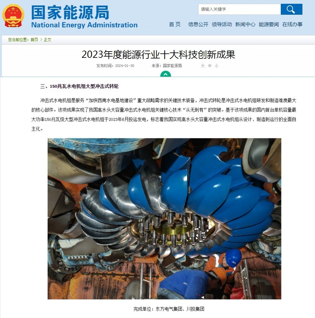 金窝国产化转轮获国家能源局2023年度能源行业十大科技创新成果