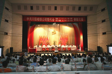 在举国上下隆重庆祝中国共产党建党86周年之际,中共川投峨铁公司党代会暨2006年度党建工作总结表彰大会于6月25日下午在该公司工人文化宫隆重召开。来自各单位的党员代表、列席代表、特邀代表、党内先进代表共计255人参加了大会。