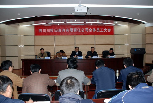 李昌伟在会上宣读了公司《关于公司机构调整的通知》和《关于韩云文等职务聘免的通知》。经公司办公会研究并报董事会批准,撤销:仁宗海项目管理部、金窝项目管理部、大发项目管理部、送出工程建设管理部、总工程师办公室、物资部。设立:办公室、人力资源部、党群工作部、资金财务部、电力营销部、工程建设管理部、安全环保部、计划合同部、田湾河水力发电总厂、成都办事处、后勤服务管理中心。