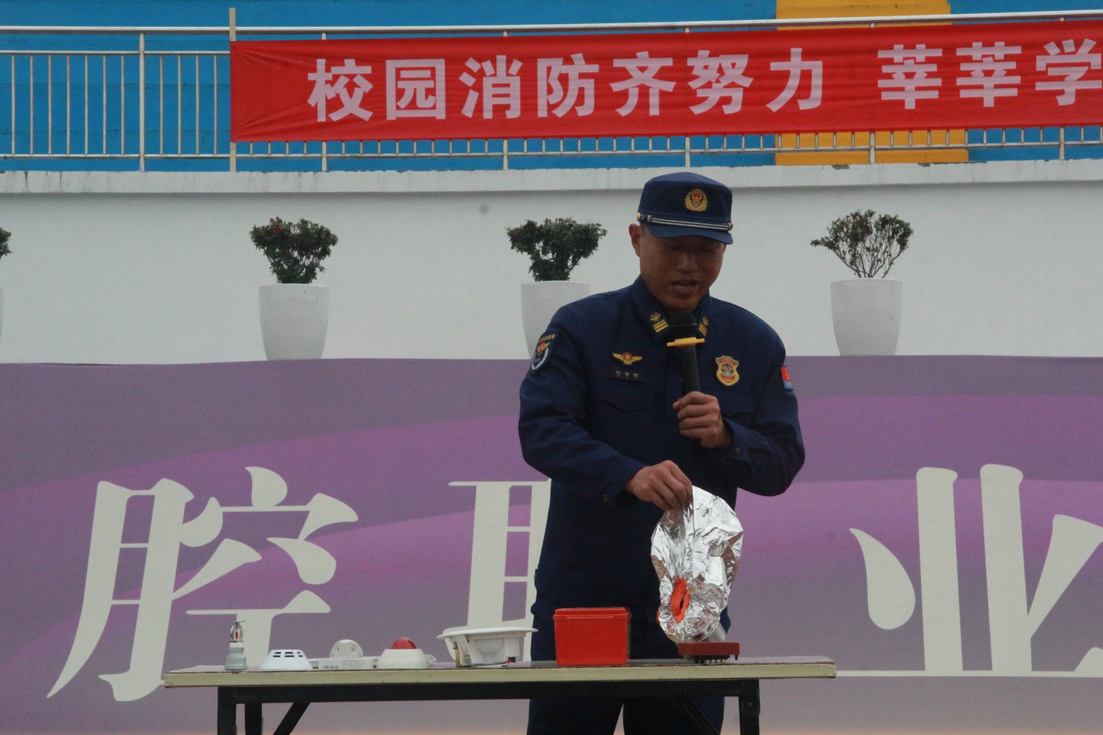 演练现场,高新区消防救援大队站长助理孙世国通过与同学们互动,进一步交流了灭火防护服、避火服、移动照明灯、排烟机、无齿锯、热成像仪和电动扩剪钳等常见消防器材装备的使用,并现场演示了灭火器使用方法,手把手指导学生正确使用灭火器“灭真火”。在消防员的指导下,同学们气氛热烈而有序,穿上灭火防护服,手持干粉灭火器,高压水枪,真正体验了一回“消防员”。